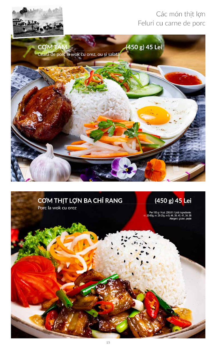 Menu highlights include a variety of pork dishes like caramelized pork with egg and rice, alongside several preparations of salmon—baked, crispy, or simmered in special sauces—that bring a delicate seafood option to the table. For those wanting something lighter, noodle bowls with crispy shrimp or pork rolls make for satisfying, easy meals throughout the day.